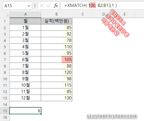 목표 매출 100백만원에 가장 가까운 실적이 몇 번째 월에 있는지 찾으려면: