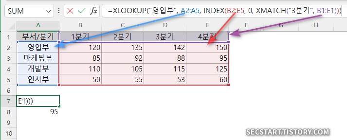 =XLOOKUP("영업부", A2:A5, INDEX(B2:E5, 0, XMATCH("3분기", B1:E1)))
