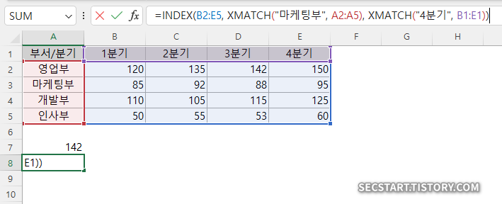 =INDEX(B2:E5, XMATCH("마케팅부", A2:A5), XMATCH("4분기", B1:E1))