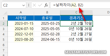 =날짜차이(A2, B2)와 같이 사용할 수 있어요.
