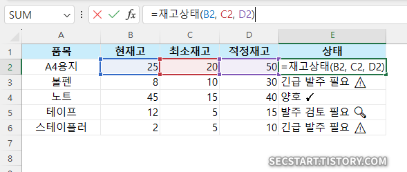 현재고, 최소재고, 적정재고 를 인수로 전달하면 재고상태가 E열에 표시됩니다.