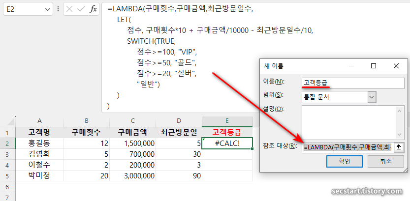 =LAMBDA(구매횟수, 구매금액, 최근방문일수,