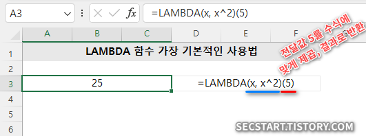 이 수식은 매개변수 x의 제곱을 계산하는 LAMBDA 함수를 정의하고, 바로 값 5를 전달해 결과 25를 얻어요. 인수를 전달하지 않으면, #CALC! 오류를 발생하면서 계산을 완료하지 못합니다.