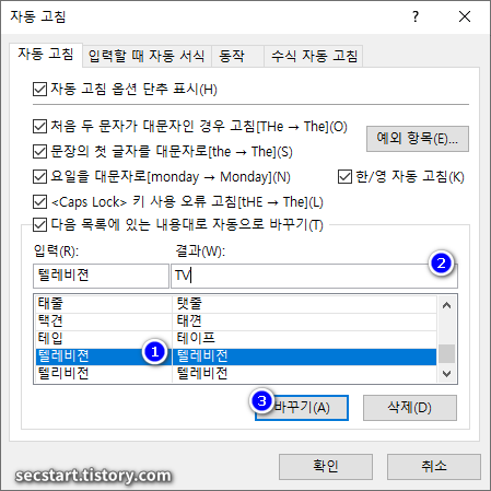 - 왼쪽 열은 ‘바꿀 텍스트’로, 입력 시 자동 수정될 잘못된 단어 또는 약어입니다.