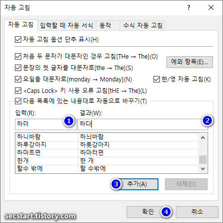 예를 들어 ‘하더’를 ‘하다’로 자동 고치고 싶다면, 각각 입력한 후 ‘추가’를 누르면 됩니다.