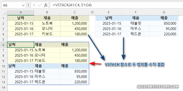 =VSTACK(FILTER(범위1, 조건1), FILTER(범위2, 조건2))처럼 사용하면 필터링된 데이터만 결합할 수 있습니다. - 동적 배열 함수와 조합: VSTACK은 다른 동적 배열 함수(SORT, FILTER 등)와 함께 사용하면 강력한 데이터 분석 도구가 됩니다.