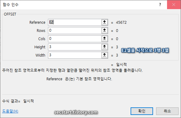 헤더 중복을 피하기 위해 OFFSET 함수로 데이터 시작인 E2 셀부터 3행 3열을 2번째 범위로 설정한다.