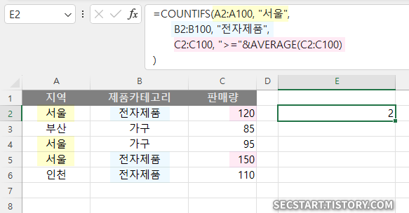 A2:A100: 지역 정보가 있는 범위"서울": 지역 조건B2:B100: 제품 카테고리 정보가 있는 범위"전자제품": 제품 카테고리 조건C2:C100: 판매량 정보가 있는 범위">="&AVERAGE(C2:C100): 판매량이 전체 평균 이상이라는 조건