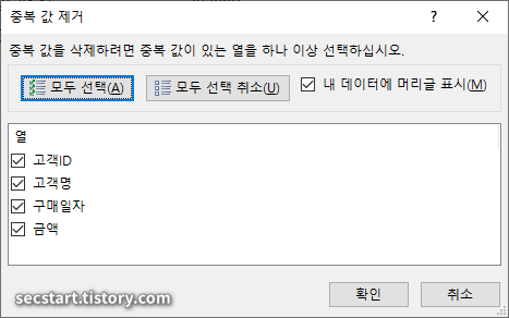 2> 중복 기준 열 선택: 중복을 판단할 기준이 되는 열을 체크합니다. (예: 고객ID, 고객명)