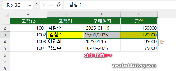 b. 연속된 데이터 선택: 첫 번째 데이터 셀 선택 후 Ctrl + Shift + 아래 화살표, Ctrl + Shift + 오른쪽 화살표