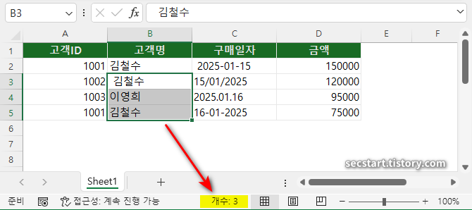 - 결과를 복사하여 원래 고객명 위치에 값으로 붙여넣기 합니다. (선택 후