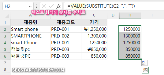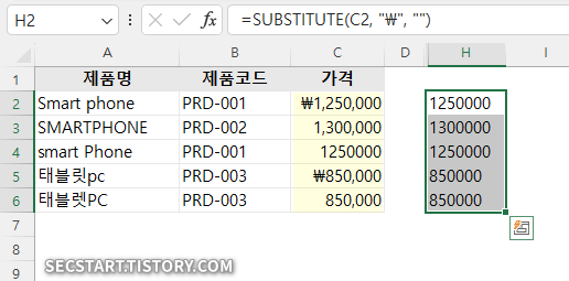 1> 통화 기호 제거: =SUBSTITUTE(C2, "₩", "") // 텍스트 왼쪽 정렬