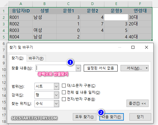 1> 결측값 찾기: Ctrl + F로 찾기 대화상자 열기, 빈 셀 찾기