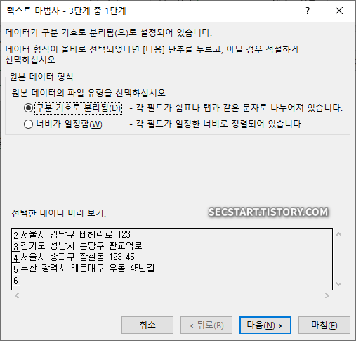 2> 구분 기호 기준 분할: 공백이나 쉼표 등 선택 (덱스트 나누기 마법사 3단계 에서 위치 지정)