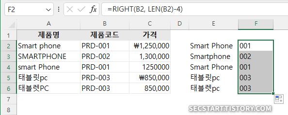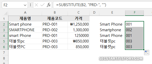 2> 또는 =SUBSTITUTE(B2, "PRD-", "") 함수로 특정 접두어 제거