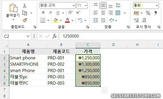 3> 가격: 숫자 형식 지정 (통화 형식 Ctrl + Shift + $)