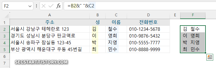 1> 간단한 결합: =B2&" "&C2 (성과 이름 사이에 공백 추가)