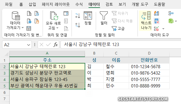 서울시 강남구 테헤란로 123, 김, 철수, 010-1234-5678
