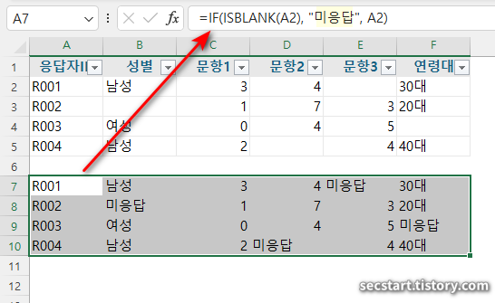 2> 결측값 표시: =IF(ISBLANK(A2), "미응답", A2) 함수 사용