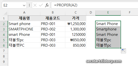 1> =PROPER(A2) 함수로 각 단어의 첫 글자만 대문자로 변환