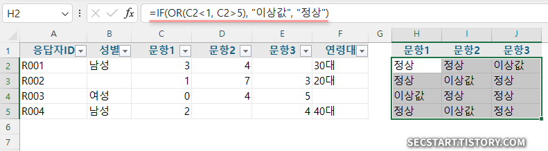 1> 이상값 찾기: =IF(OR(C2<1, C2>5), "이상값", "정상") 함수로 범위 벗어난 값 표시