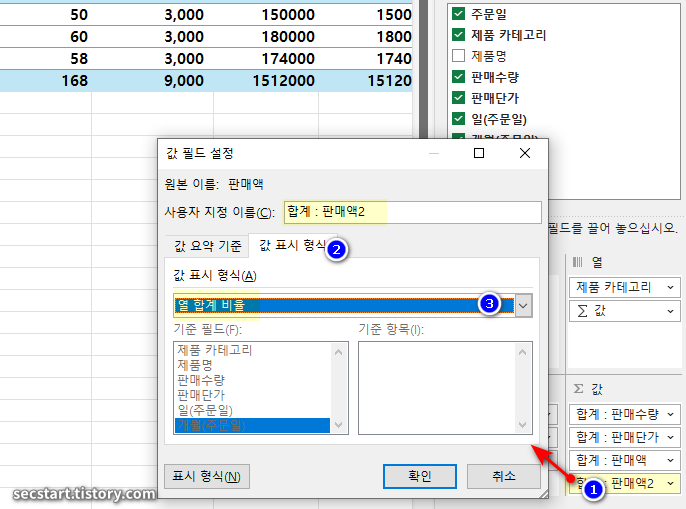 - "값 표시 형식" 탭으로 이동하여 "열 합계 비율"을 선택하고 "확인"을 누릅니다. 이제 각 카테고리별 판매액이 해당 월의 전체 판매액에서 차지하는 비중이 백분율로 표시됩니다.