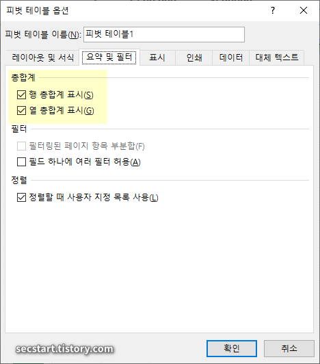 7단계: 총합계 표시: 피벗 테이블 내에서 마우스 오른쪽 버튼을 클릭하고 "피벗 테이블 옵션"을 선택합니다. "요약 및 필터" 탭에서 "행 총합계 표시" 및 "열 총합계 표시"를 체크하고 "확인"을 누릅니다.