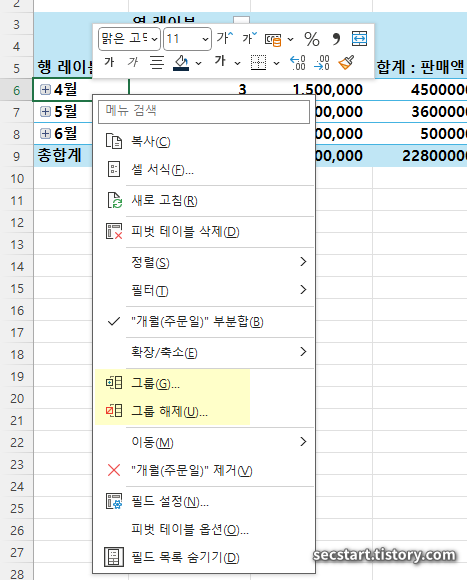 4단계: 월별 그룹화: "행" 영역의 "주문일" 필드에서 마우스 오른쪽 버튼을 클릭하고 "그룹"을 선택합니다. "그룹화" 창에서 "월"을 체크하고 "확인"을 누릅니다. 이제 행 레이블이 월별로 표시됩니다.