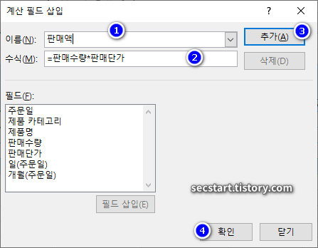 3> "수식" 입력란에 =판매수량*판매단가 를 입력하고 "추가" → "확인"을 누릅니다.