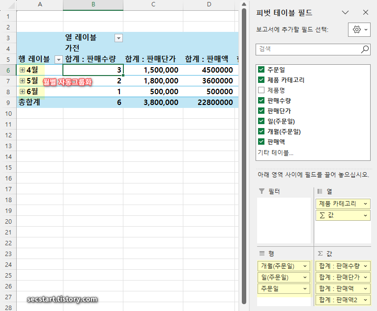 - 행 레이블: "주문일" 필드를 "행" 영역으로 드래그합니다. (월별 분석을 위해 그룹화 필요)(자동 그룹화)