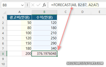 200만원의 광고비를 투자했을 때 예상되는 수익을 FORECAST 함수로 계산해보세요: