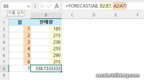 결과값은 338로 나오게 돼요. 즉, 7번째 달의 예상 판매량은 약 338개로 예측된다는 의미예요. 예측값은 엑셀 버전에 따라 살짝씩 다를 수 있어요. 📈