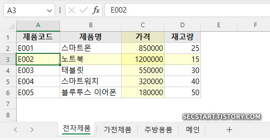| 전자제품 | E002 | 수식 결과가 표시됨 |