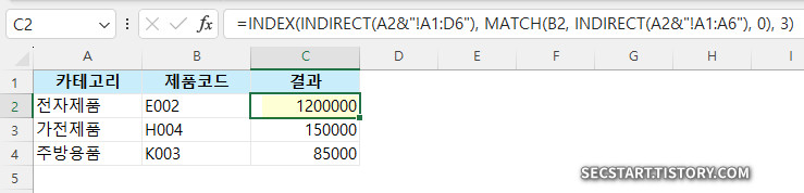 이런 방식으로 사용자는 카테고리와 제품코드만 입력하면 여러 시트에 분산된 데이터를 자동으로 찾아올 수 있습니다. 카테고리명을 변경하면 다른 시트의 데이터를 참조하게 되고, 제품코드를 변경하면 다른 제품의 정보를 찾아오게 됩니다.