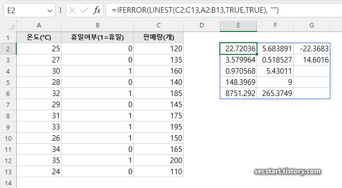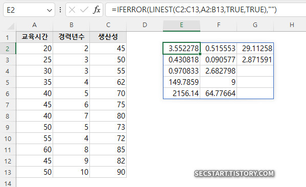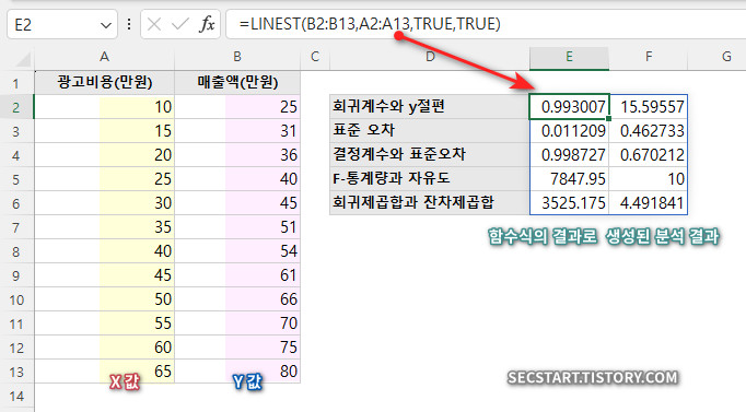 📊 LINEST 함수 결과 해석하기