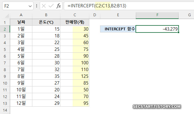 사용 공식: =INTERCEPT(C2:C13, B2:B13)