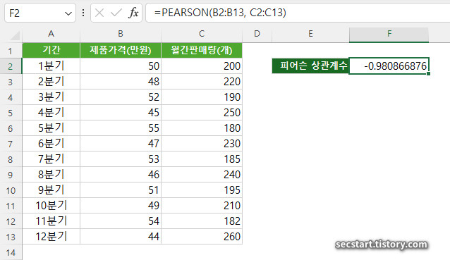 - 상관 계수를 계산할 셀에 다음 수식을 입력합니다: