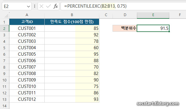 예제 3: 고객 만족도 조사 - 상위 25% 고객의 만족도 기준점 찾기 (75번째 백분위수)