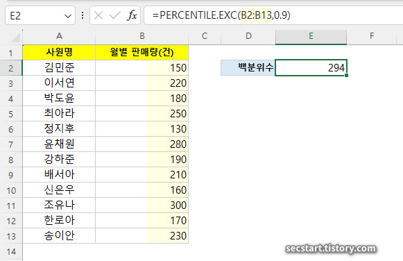 엑셀은 B2부터 B13까지의 판매량 데이터 중 90번째 백분위수에 해당하는 값을 계산해서 보여줄 거예요. 이 값은 상위 10%를 제외한 직원들의 실적을 가늠하는 기준이 될 수 있겠죠? (실제 값은 데이터 분포에 따라 계산됩니다. 이 경우 약 294가 나올 수 있습니다.)