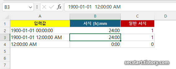 - 1900-01-01 12:00:00 AM → 사용자 지정 서식으로 [h]:mm 형식을 적용하면 24:00으로 표시됨