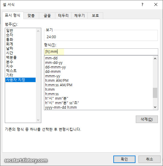 - [h]:mm 는 시간 누적 합산 형식이에요.