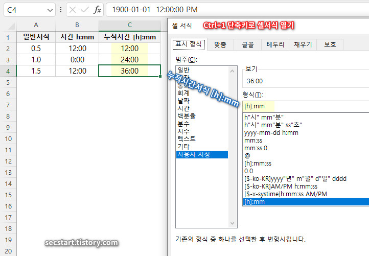 서식으로 표시하면 24시간이 넘으면 다시 0부터 시작해서 결과가 황당하게 보일수 있어요!