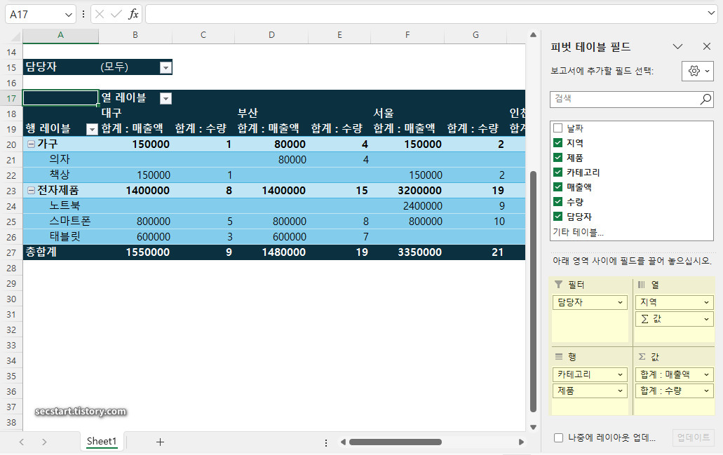=GETPIVOTDATA("매출액", A17, "지역", "부산", "제품", "스마트폰")