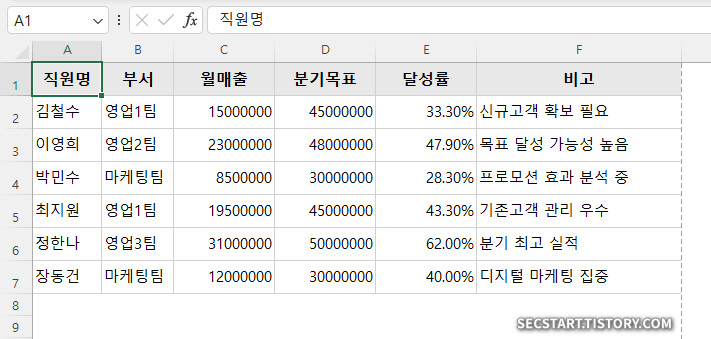 직원명,부서,월매출,분기목표,달성률,비고