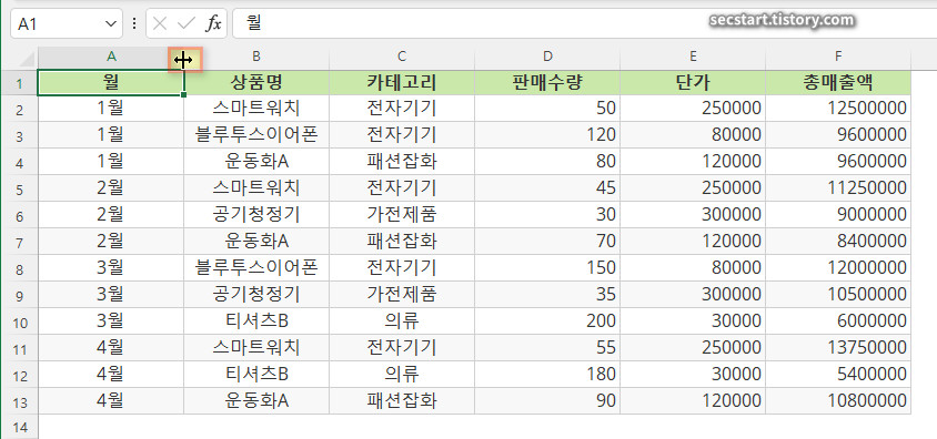 - 드래그: 열/행 경계선 끌기