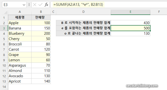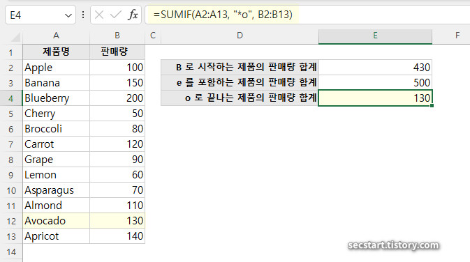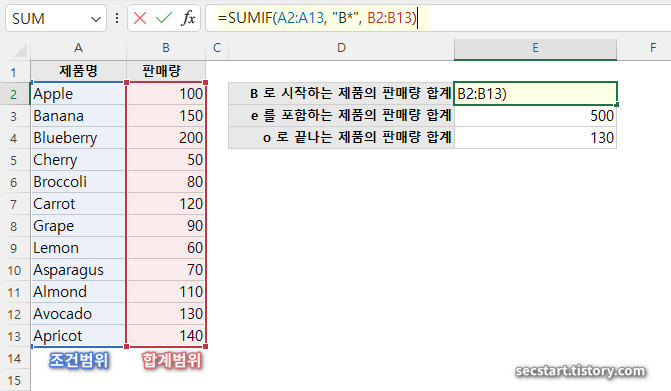 "B"로 시작하는 제품의 판매량을 모두 더해줍니다. "B" 로 시작하는 제품명(3,4,6행)의 판매량 합계(150+200+80)는 430 이에요.