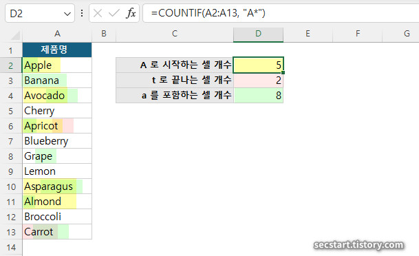 "t"로 끝나는 제품의 셀 개수를 알려줍니다. 6행과 13행, 2개가 결과에요.