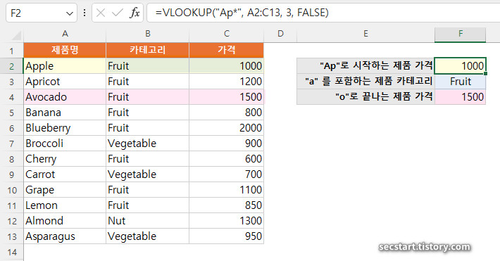 A2:C13 범위 첫번째 열에서 "Ap"로 시작하는 첫 번째 제품의 가격을 반환해요. 3행도 "Apricot" 으로 "Ap" 로 시작하지만 2행이 먼저 검색되어 반환값은 1000 이에요.