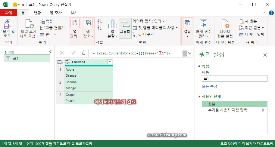 ㄴ. 연결 - 파워쿼리 편집 창이 뜨면서 가져오기 된 데이터