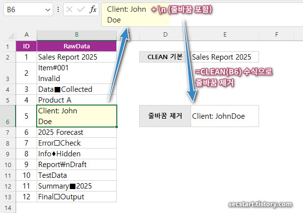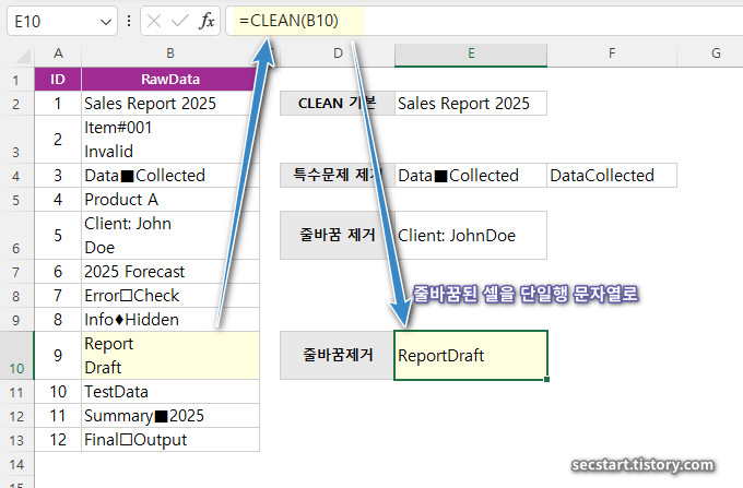 - 쉽게 이해하기: A1 셀에 "판매보고서\n2025"가 있다면, CLEAN 함수는 "\n"(줄 바꿈)을 지우고 "판매보고서2025"로 만들어줘요.